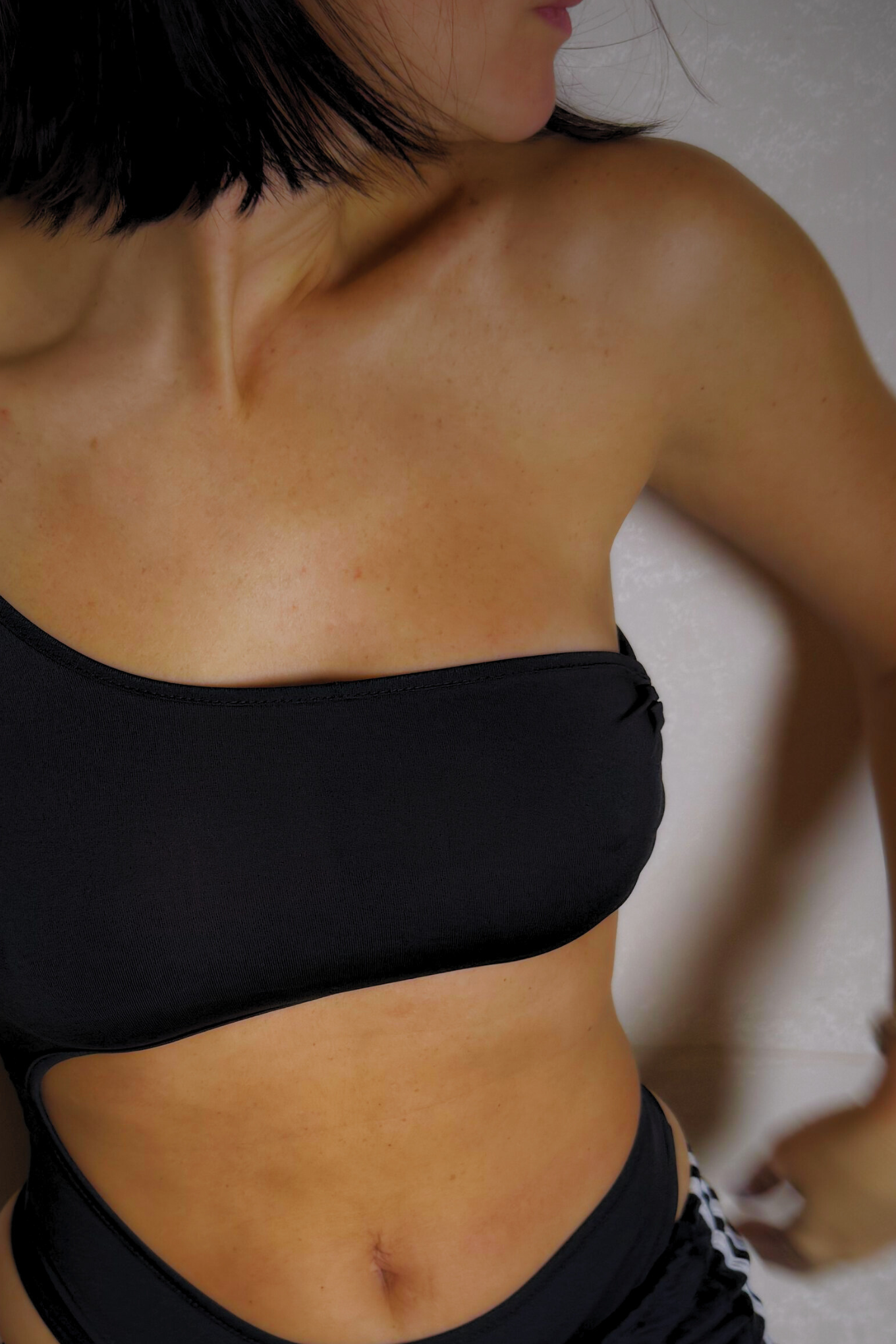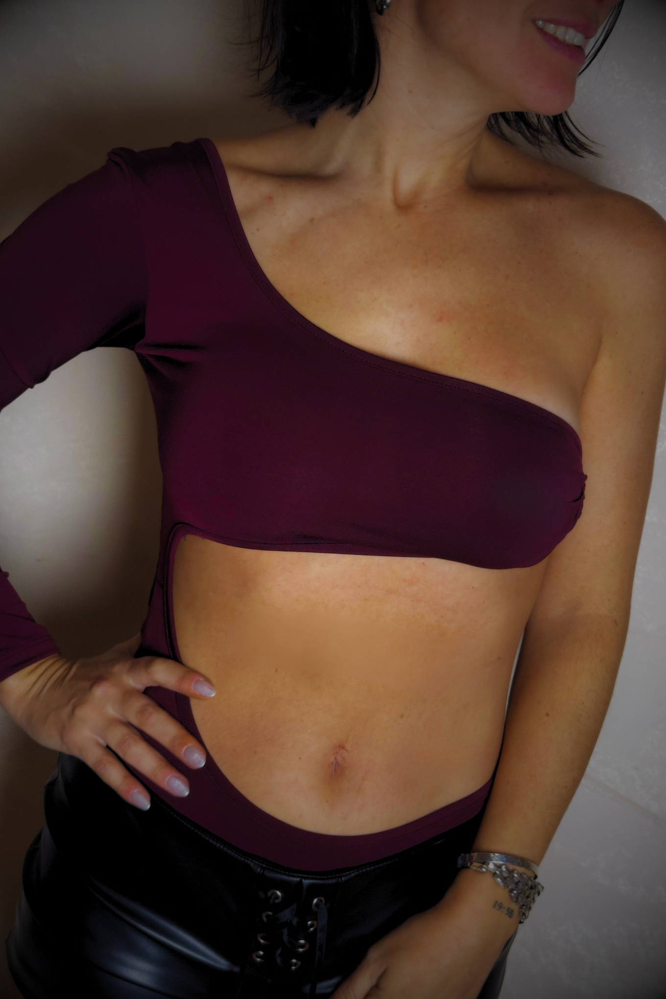 El body CHERRY combina asimetría, recorte extremo y una estructura que abraza lo justo. Manga larga de un lado, corte cavado del otro y espalda descubierta.